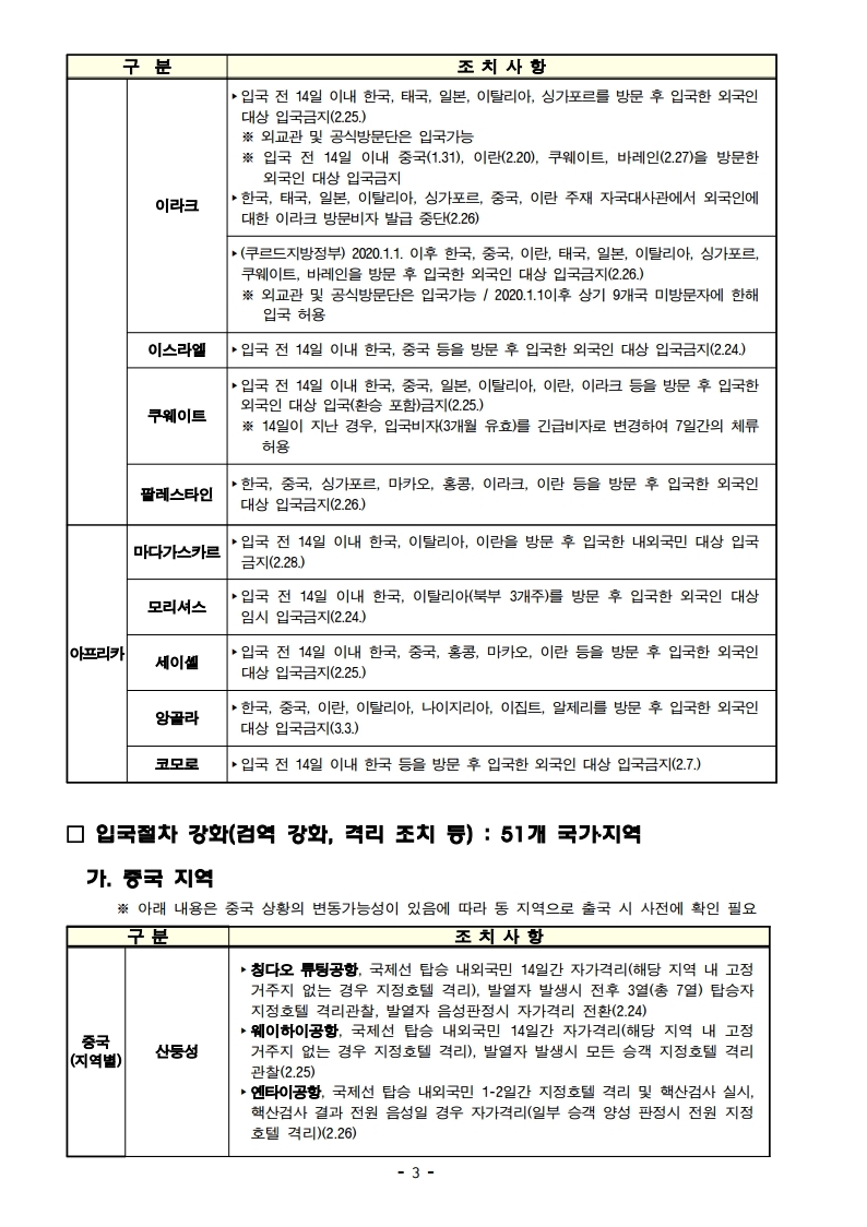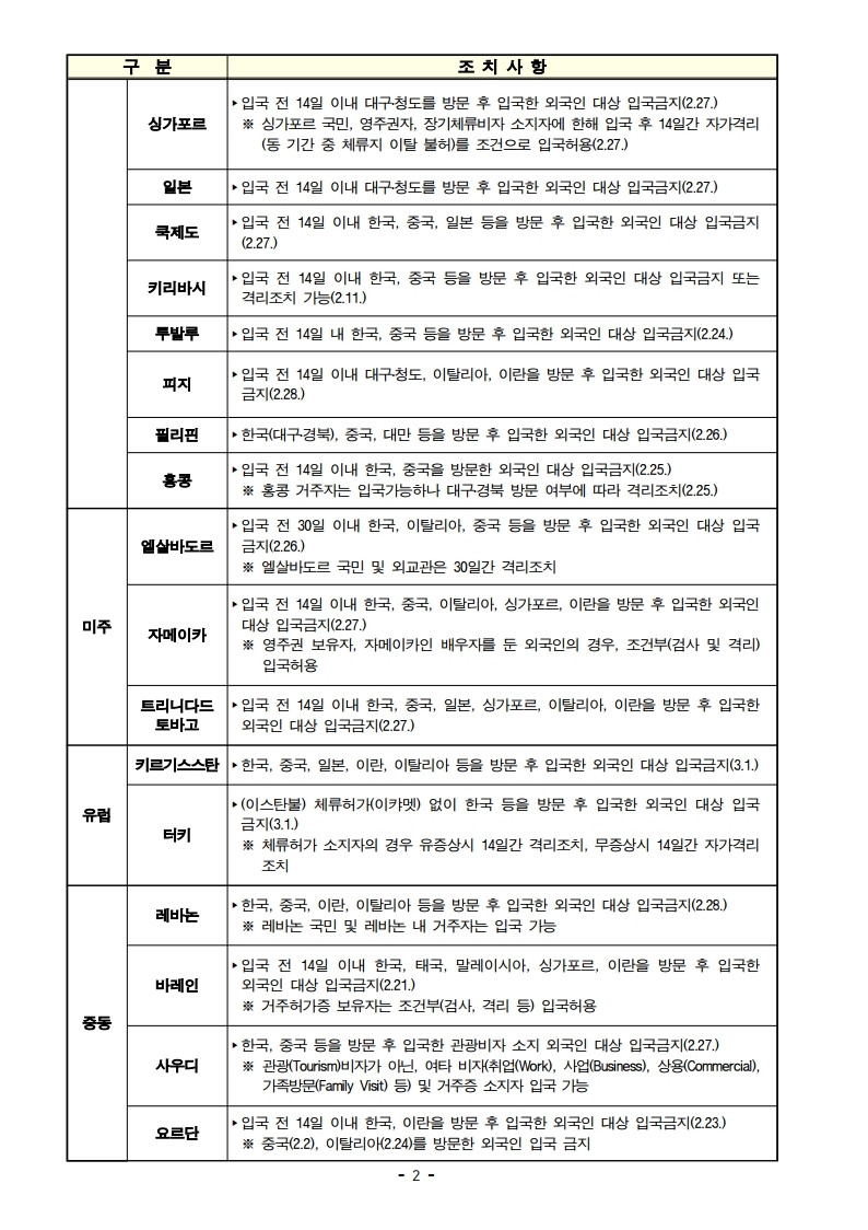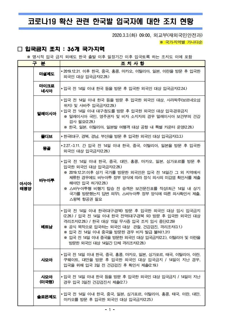 (3/3 기준) 신종 코로나바이러스 관련 출입국 제한사항