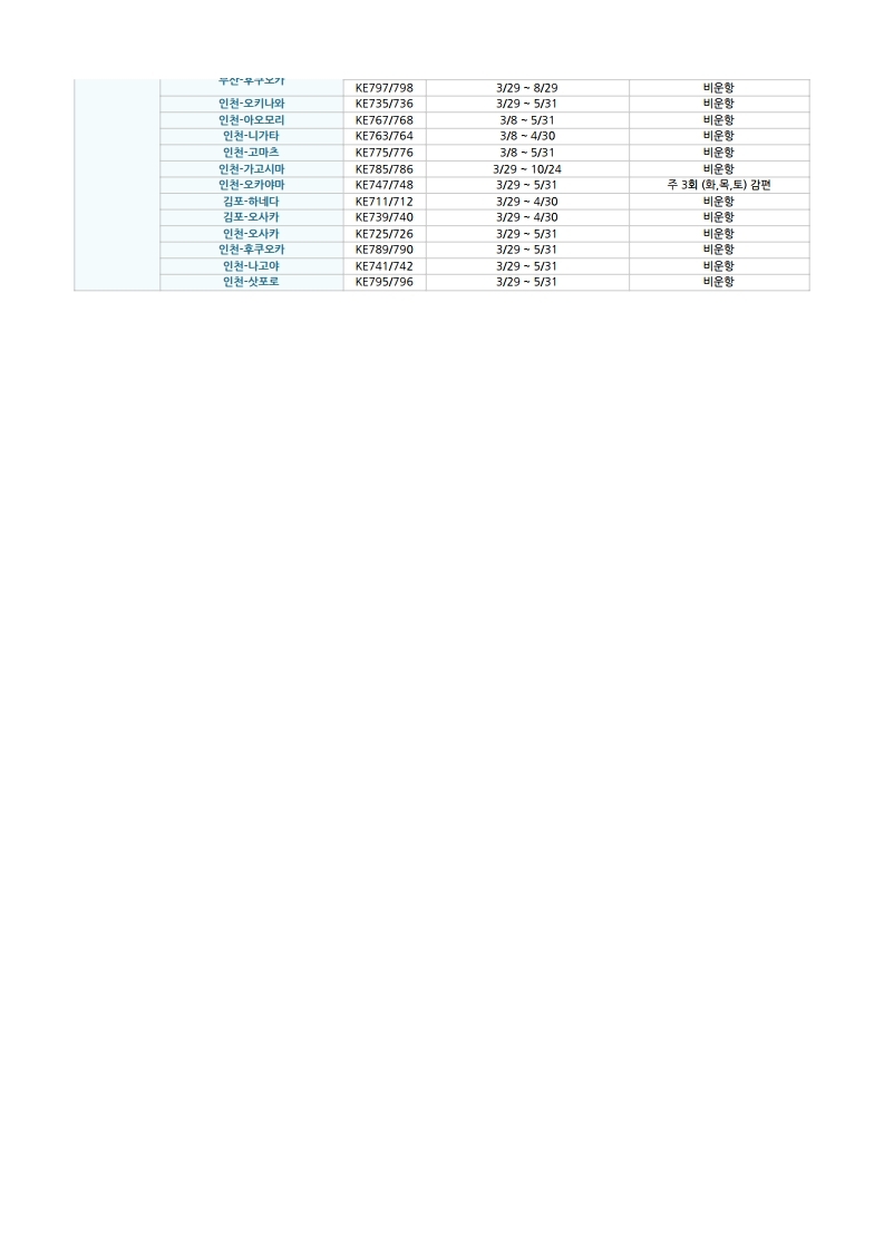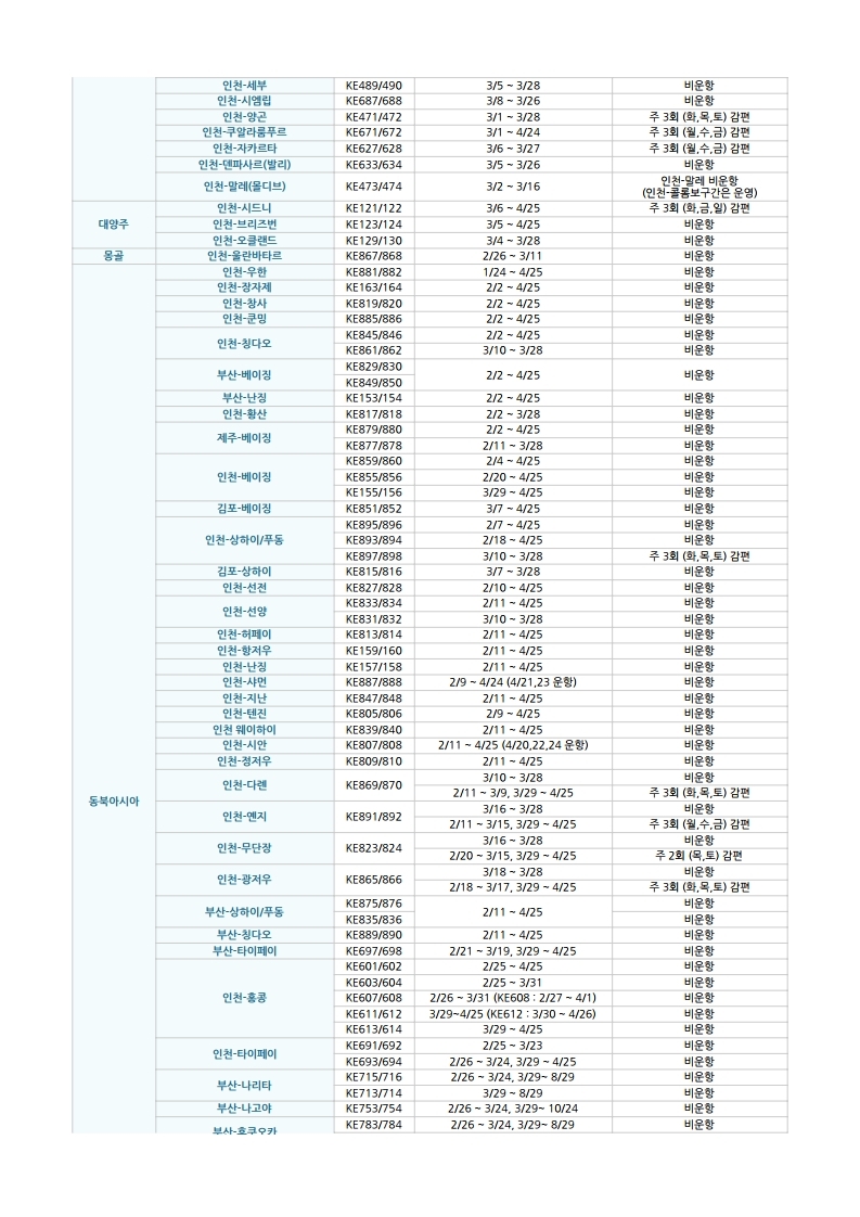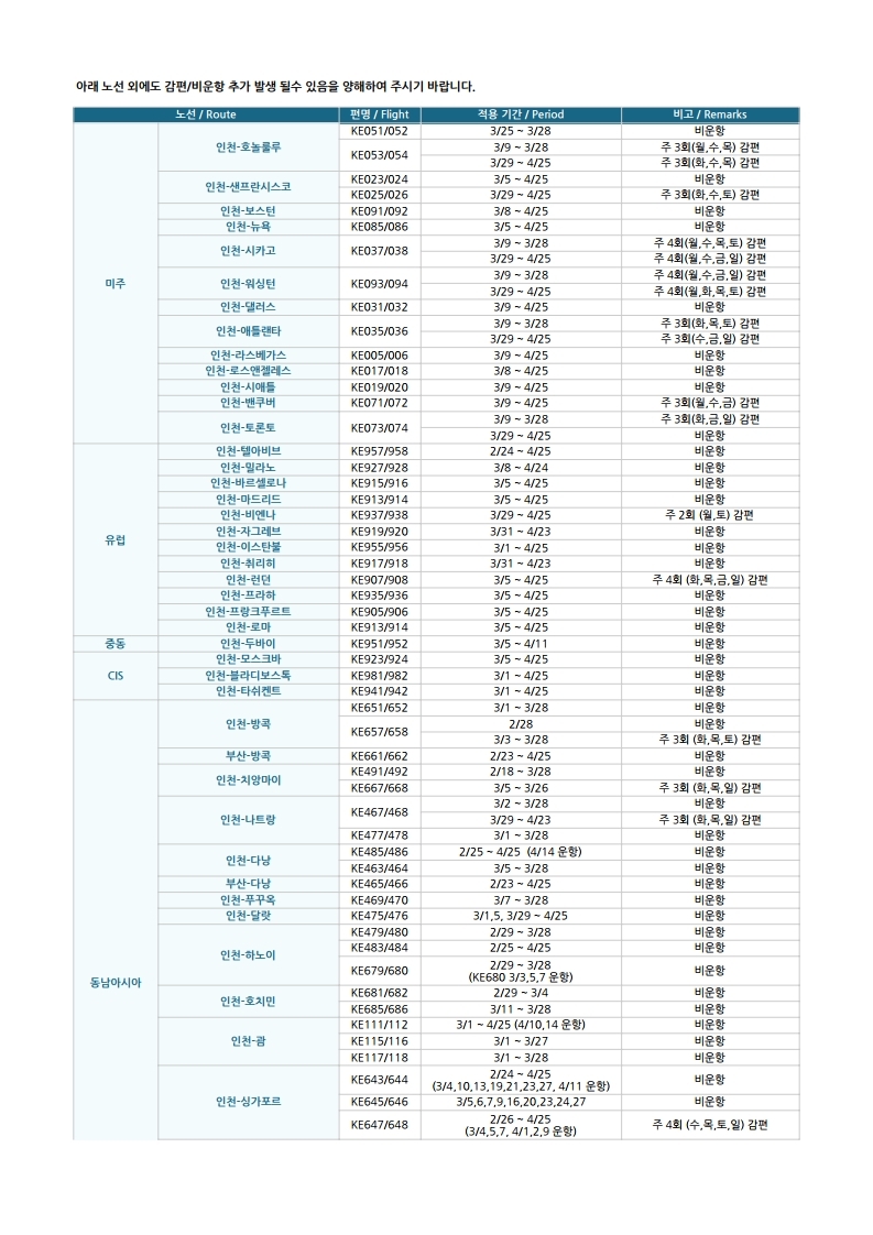(3/4 기준) 대한항공 비운항 및 감편 노선 안내