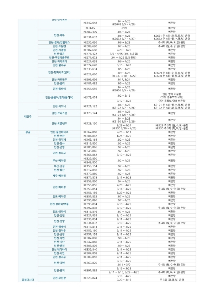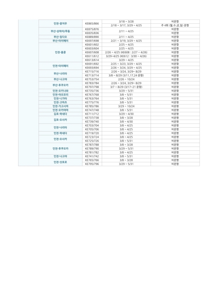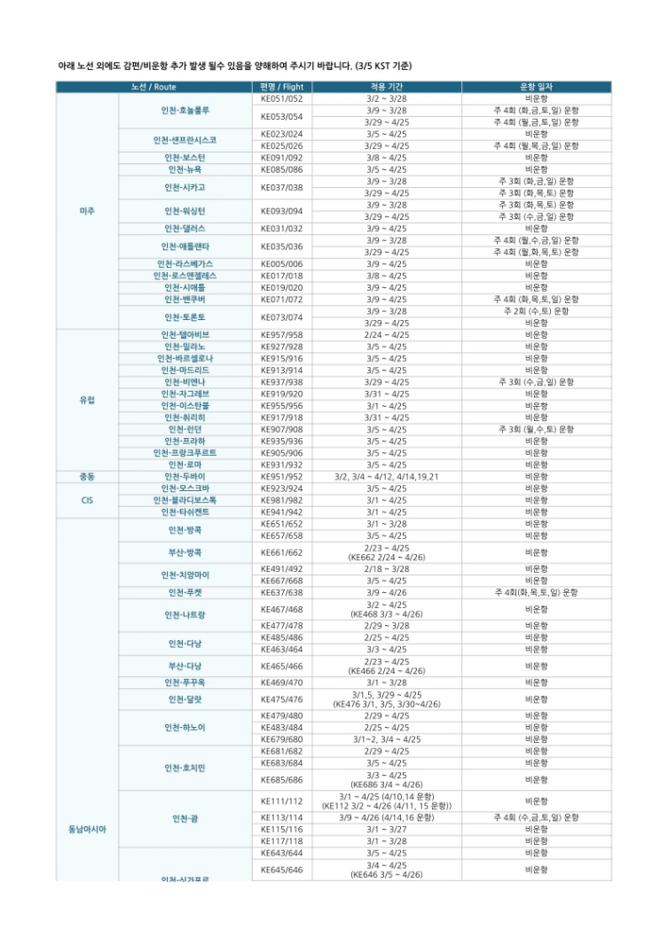 (3/5 기준) 대한항공 비운항 및 감편 노선 안내